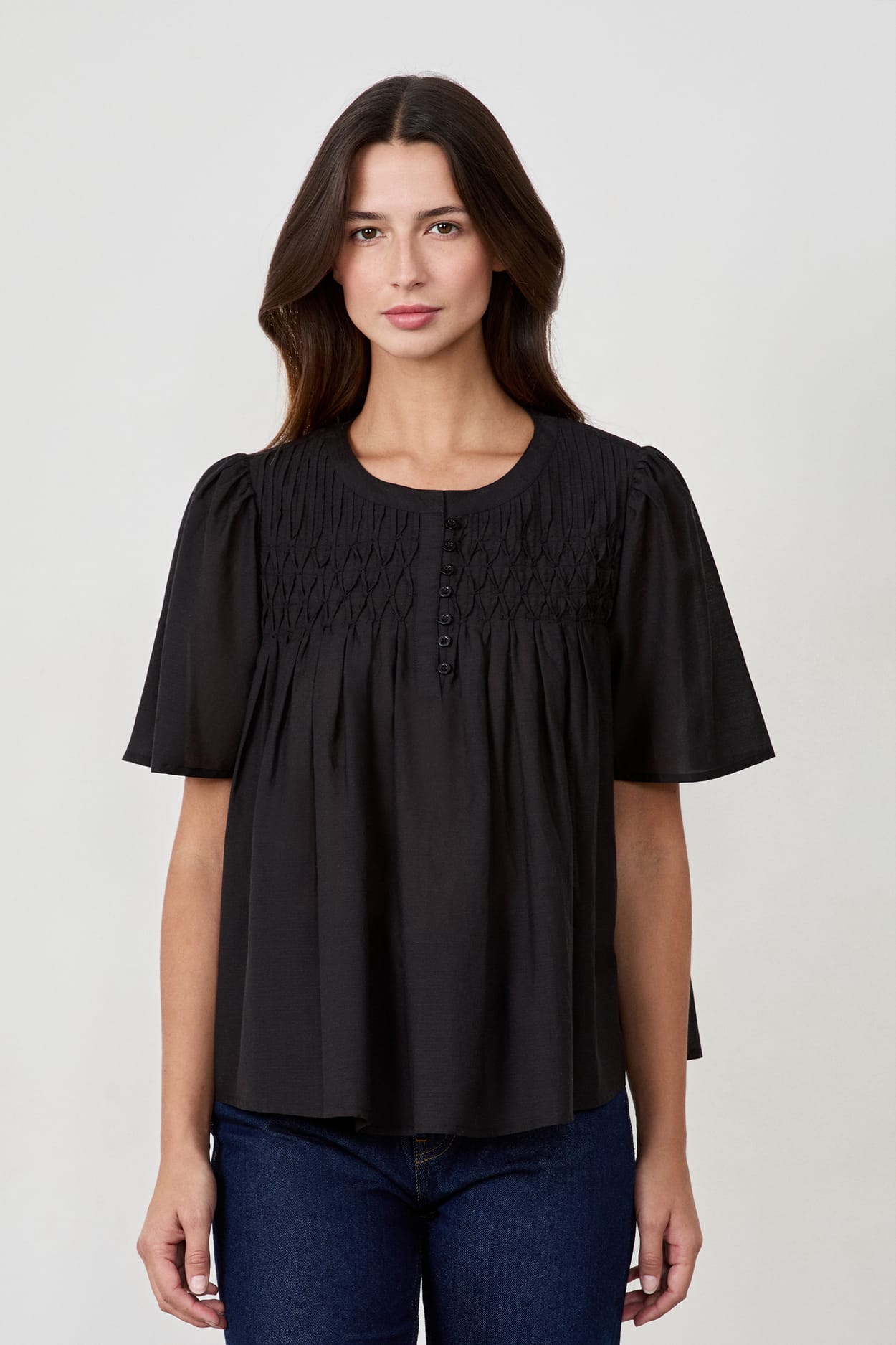 Cette blouse fluide à manches courtes dévoile un col rond et une patte de boutonnage partielle. Elle se distingue par un plissé subtil et un motif losange texturé sur la poitrine.