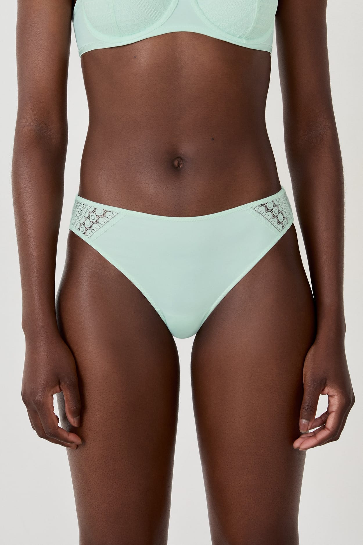 La maille légère et la dentelle travaillée de cette culotte dessinent des motifs délicats et des détails ajourés pour un subtil jeu de transparence.
