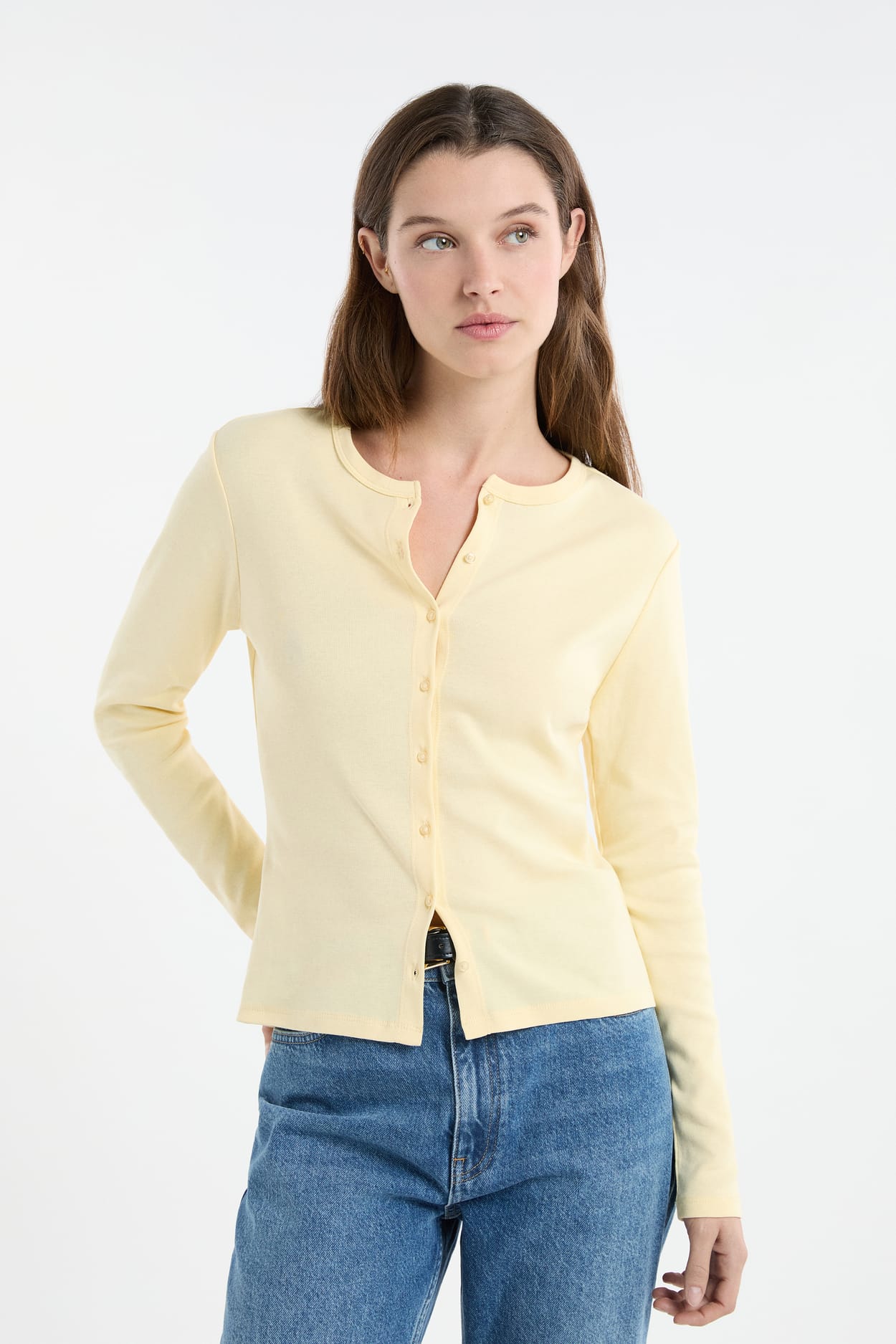 A medio camino entre una camiseta y un chaleco, esta camiseta de manga larga tiene cuello redondo y cierre con botones. Confeccionada en algodón, combina suavidad y comodidad.