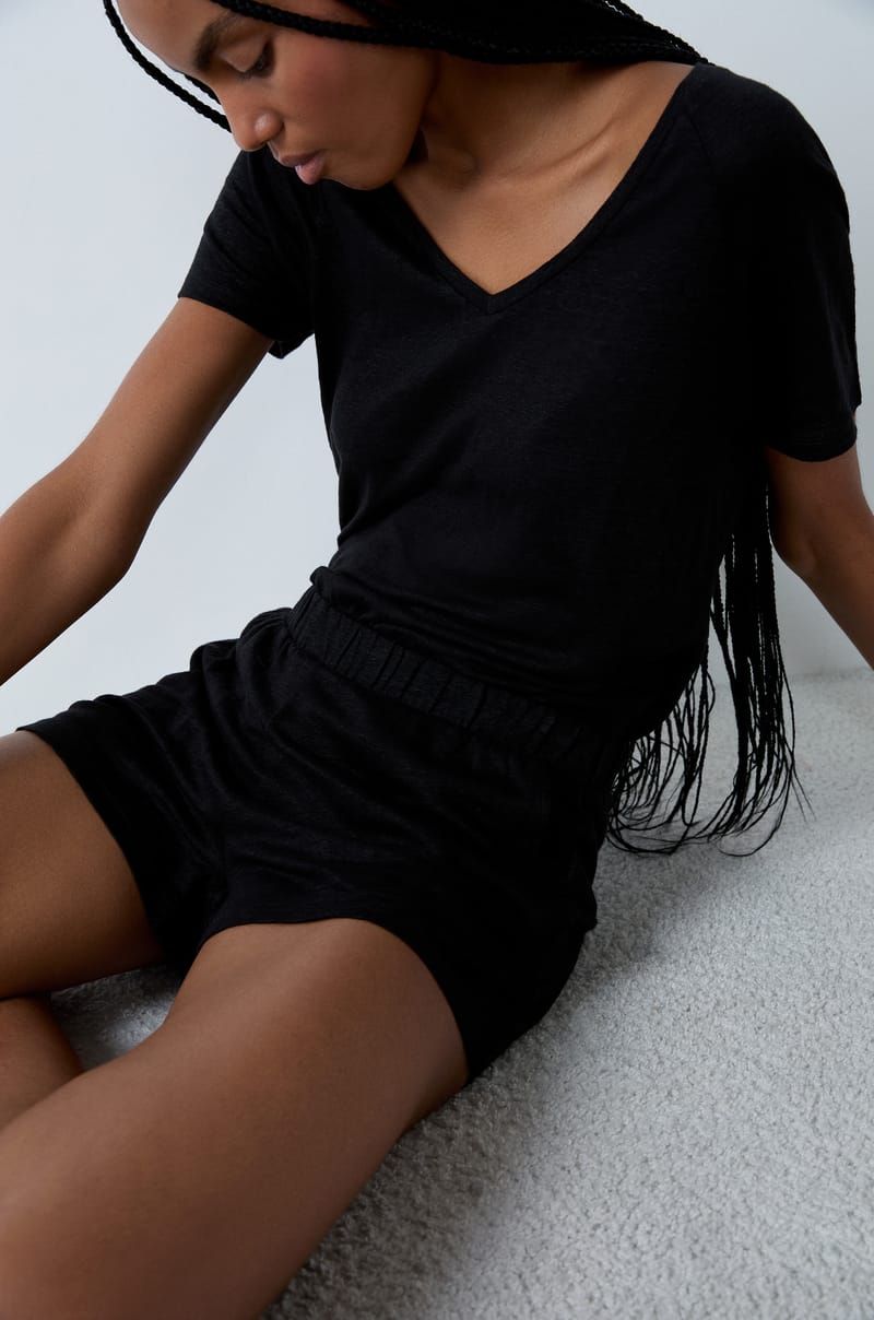 Estos pantalones cortos de pijama, con cintura elástica, están confeccionados en un tejido ligero de lino y cuentan con bolsillos muy cómodos para dormir bien.
