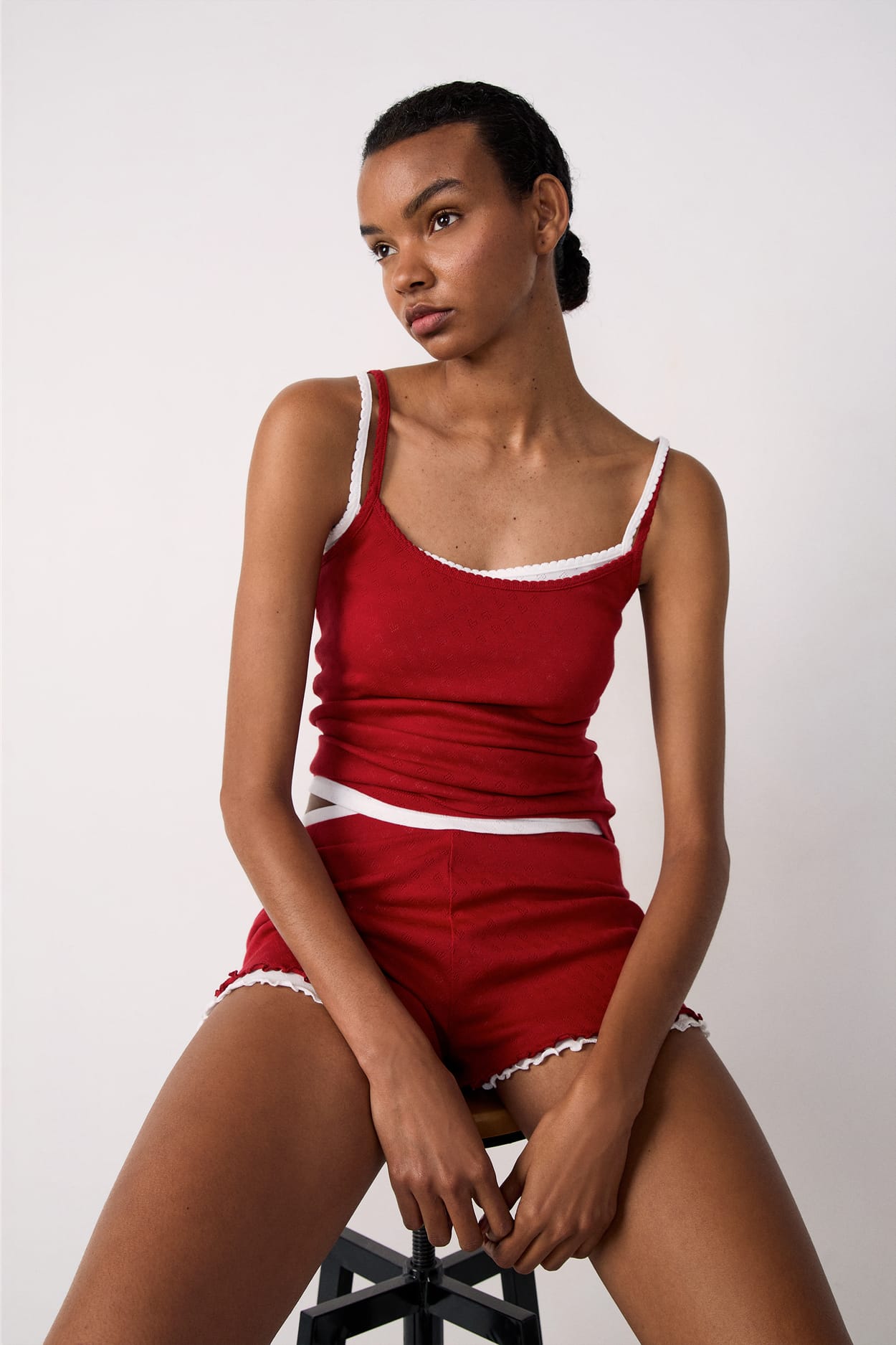Pantalón corto de pijama de algodón acampanado con detalle de pointelle...