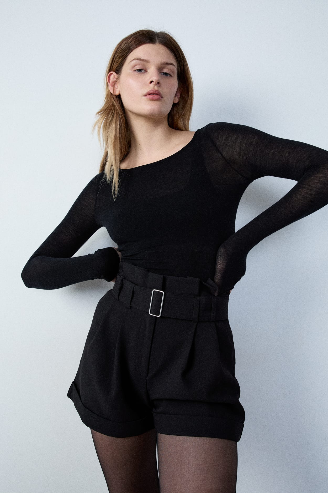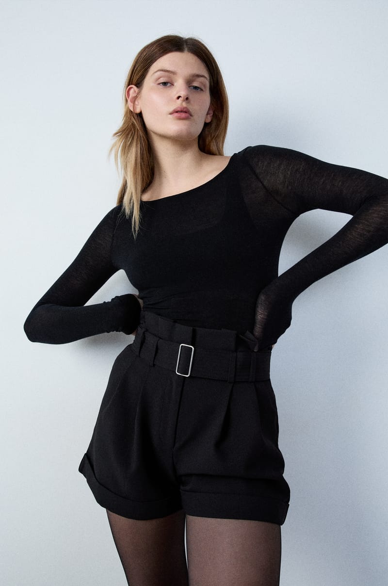 La silueta se realza en este pantalón corto de cintura alta con un cinturón ancho. Con dos bolsillos en la parte delantera, es un básico imprescindible para un look elaborado en el día a día.