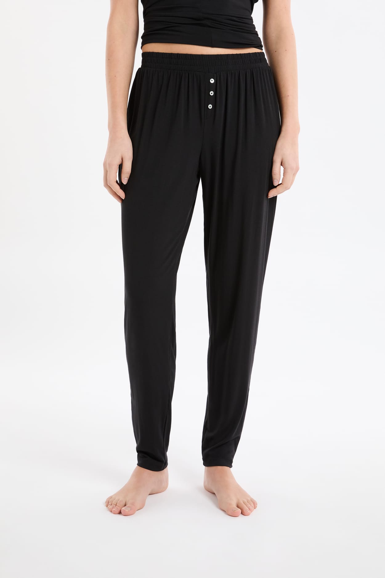 Suaves y ligeros, estos pantalones de pijama son ideales para las noches de verano. Con cintura elástica, están adornados con botones y combinan con las camisetas a juego.
