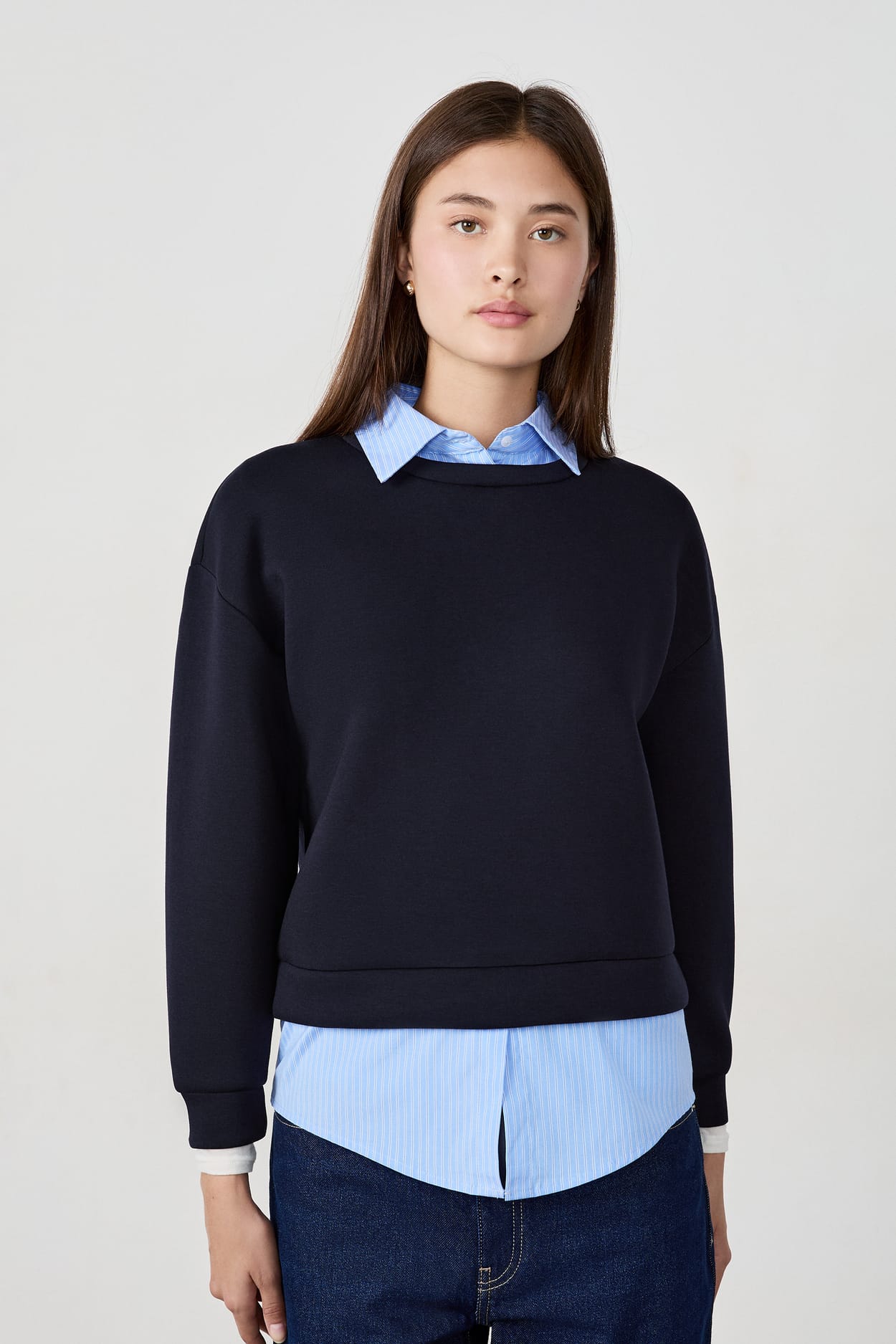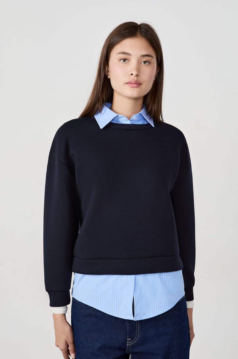 Ce sweat revisite le style preppy avec une chemise rayée intégrée. Allure superposée garantie dévoilant le col classique et le bas de la chemise pour un effet deux-en-un.