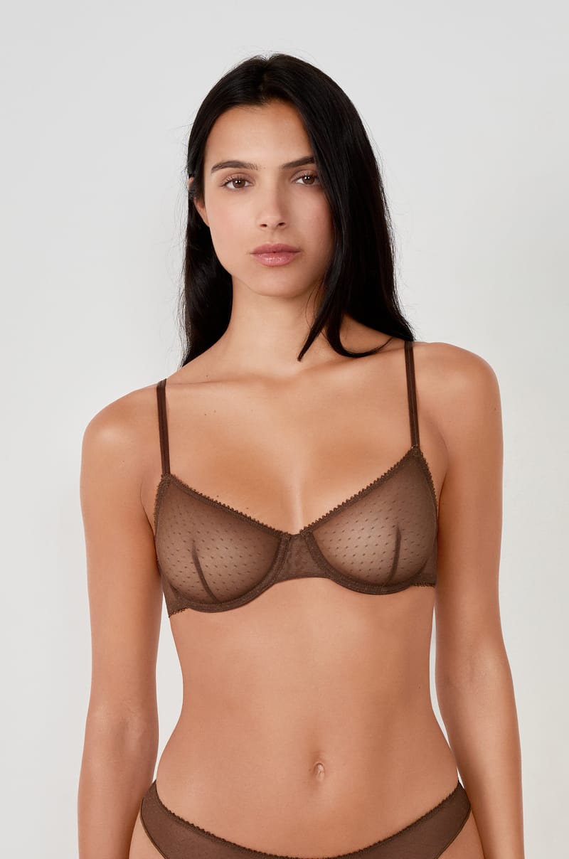 Aérien et intemporel, ce soutien-gorge classique est confectionné en tulle transparent, sublimé par un motif à pois. Il est muni de fines bretelles et d'armatures pour assurer le maintien. La ligne supérieur des bonnets est festonnée pour une touche subtile et féminine.