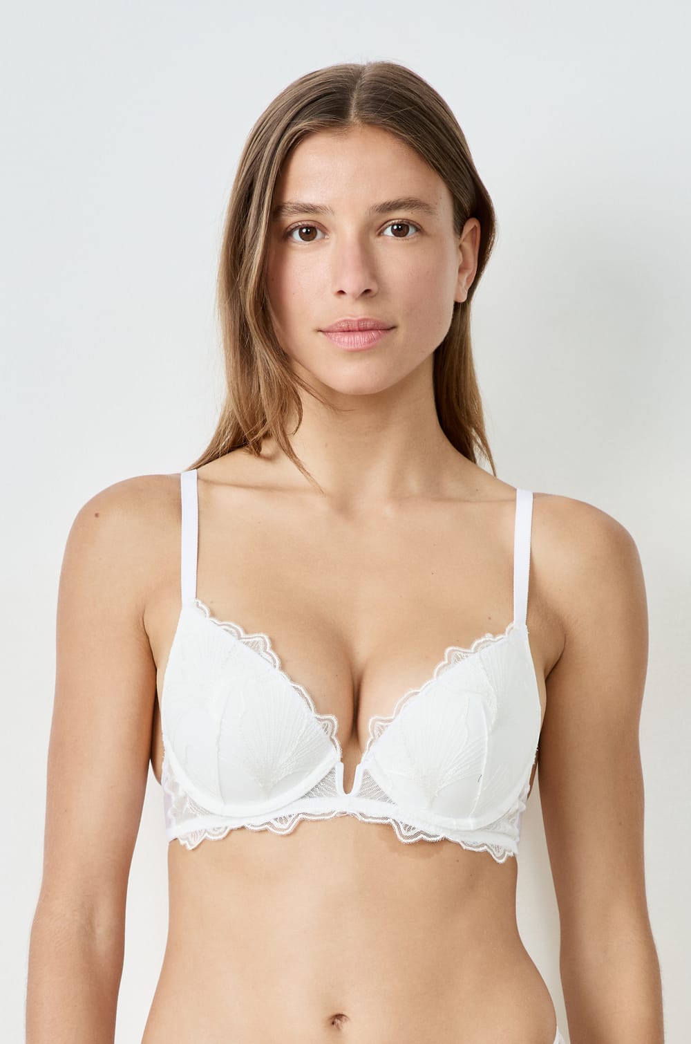 Nuestra experiencia en la confección de corsés se expresa con precisión en este sujetador push-up, donde los bordados florales se posan delicadamente sobre el tul.