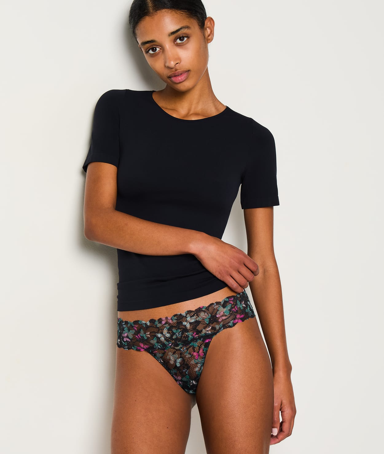 Bajo su encaje, este tanga estampado revela sutilmente la piel. El juego de transparencias y hendiduras le confiere un aspecto ultra sexy. Su forma en V abraza sensualmente tus curvas para revelar tu silueta.
