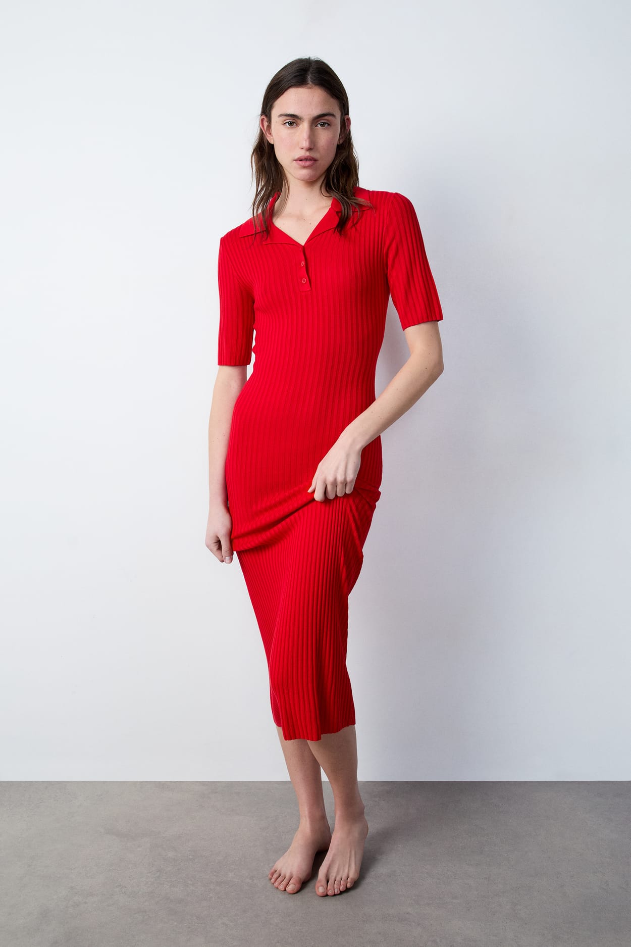 • Vestido largo \n• Tejido acanalado \n• Cuello con solapa \n• Mangas largas \n• 4 Botones en la parte delantera